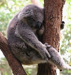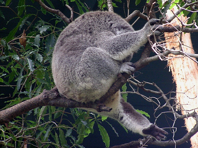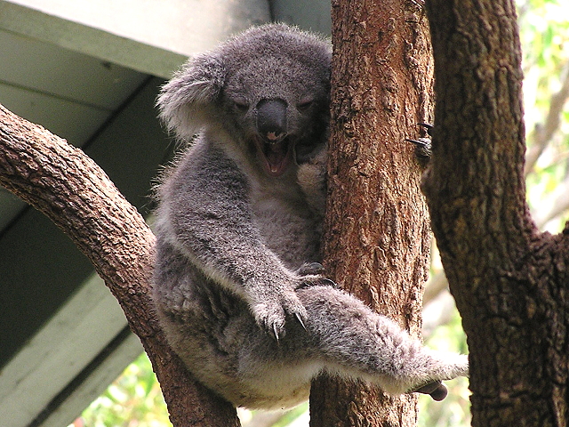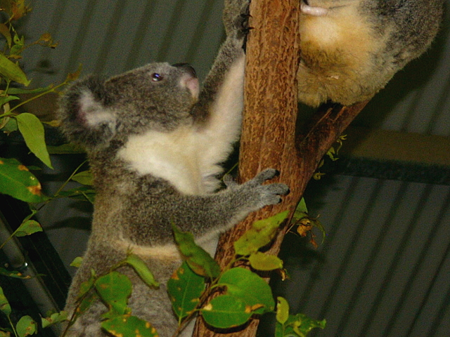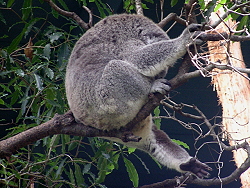 The koalas are not normally active, but we got very lucky. Here, a mother is lazily sitting in a tree with a dorky look on her face. Her baby is below and wants to get her attention; note the big claws. |