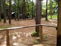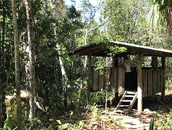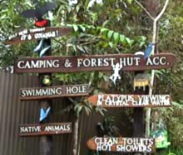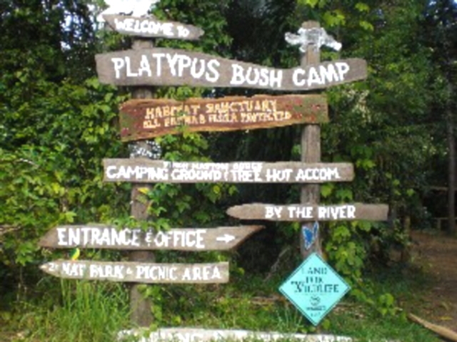 It was dark and we initially thought the many camp signs were funny, but then we couldn't find any buildings or signs of people. After walking across a rickety bridge, we finally found an old man having dinner in a ramshackle hut ... it was Wassi, the owner! He wasn't friendly and didn't like my complaints about the bad directions. He said that we could pay to use the parking lot, but he had no electricity ... which would not be good for the stuff in the fridge. On top of that, there was high humidity, lots of bugs and a threat of rain ... which could strand us here for days. Even though we had spent a whole day getting to this place, we left and sadly gave up on seeing the Platypus. We had to backtrack, in the dark, for a long way before heading south again. We then stayed at the next campground we came upon ... not a good day :( :( |