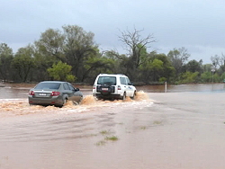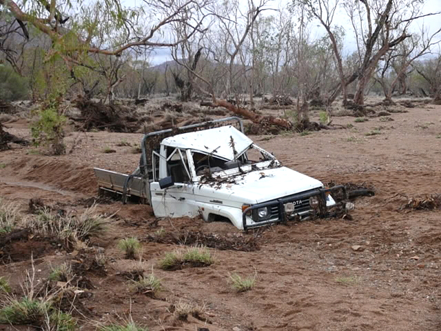 Since the animals seemed to think that the water was dangerous, and since we didn't want to end up like this truck did during a recent flood, we decided to turn around and find yet another way. |