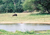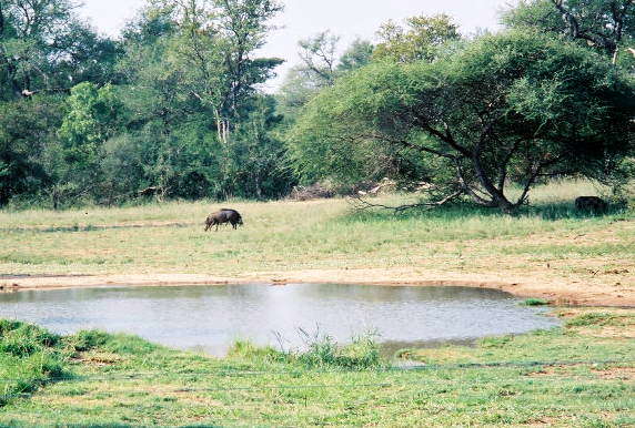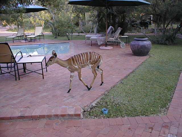 There was a nice waterhole about 50 feet from the front of our rooms. The only thing separating us from the animals was a small electric fence. Impala and Warthogs were the most common visitors. |