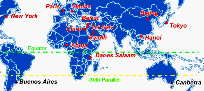 The cities of Buenos Aires (Argentina) & Canberra (Australia) lie below the 30th parallel. Both places would have been interesting places to live; next time?