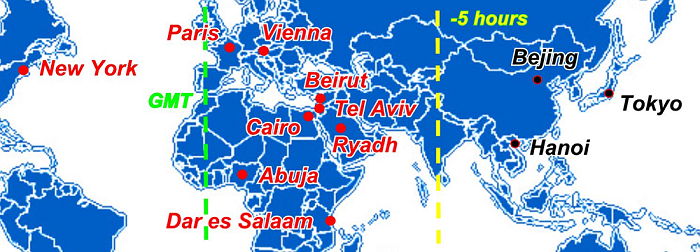 GMT (Grenwich Mean Time) is the standard for time. England has the "base time zone"; every other time zone is plus (west) or minus (east) from there. The Asian cities are more than 5 "time zones" away and thus fall off the list. Click here to get the next question.