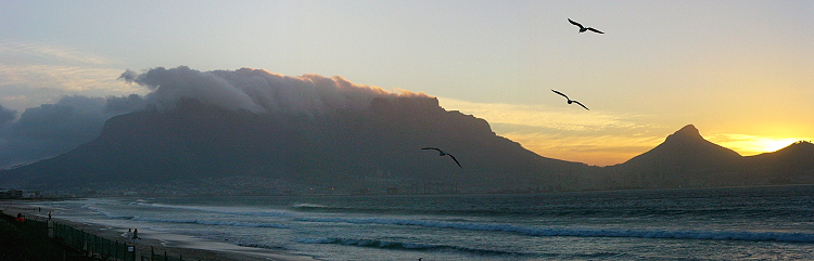 Behind us is Camps Bay, a ritzy hill-side town with a main street full of trendy bars & restaurants. The western side of Table Mtn is visible; the peaks are nicknamed "The 12 Apostles". |