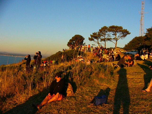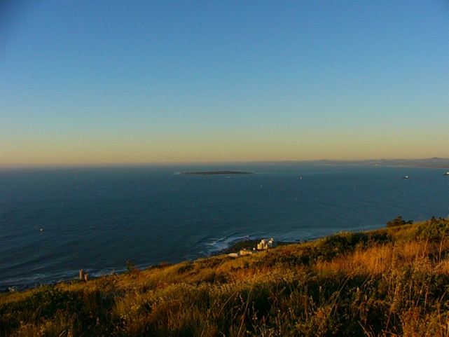 | There were a lot of people, but we found a place to sit down. From this vantage point we could see Robben Island, where Nelson Mandela & other political prisoners were kept during the Apartheid era. | ||