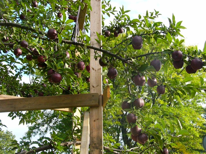 | The zenias and cannas in the rock garden were in full bloom. | The apple trees were over-producing; it was funny to see the wood structures that Dad built to keep the branches from breaking. | |