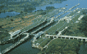 | To lessen the risk of a mishap, ships are cabled to locomotives at the approach of each series of locks and are pulled through them. There are 80 such locomotives , all made by Mitsubishi, at $ 1 million each. No force besides gravity is required to adjust the water level between the locks. As the locks operate, the water simply flows into them from the lakes or flows out of them to the sea. |