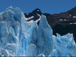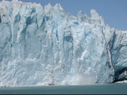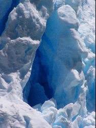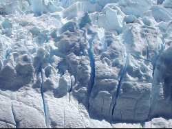 | The glacier moves very slowly, only a inches per day. The bottom and sides scrape the earth, taking small amounts of dirt and rocks with it... if the glacier would melt, we would see a smooth surface. | Just as we began to move away, we heard a real loud bang; this is all I saw of the falling ice chunk. | |