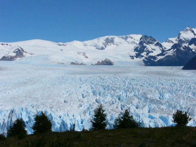 | We left the boat and hiked on a trail that took us up a hill. | From this vantage point we could see the body of the glacier. | It's a slow-moving river of ice which began at the mtn. tops. |