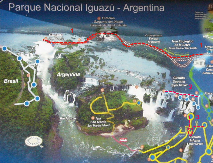 After completing tours #1 & #2 (see red routes on the map), we took a short lunch break. After the break we walked to the "Lower Circuit" area (see red #3 on the bottom-right of the map). From this trail we will see the bottom part of the falls that we walked on top of during Tour #2. I sure hope that made sense!