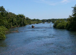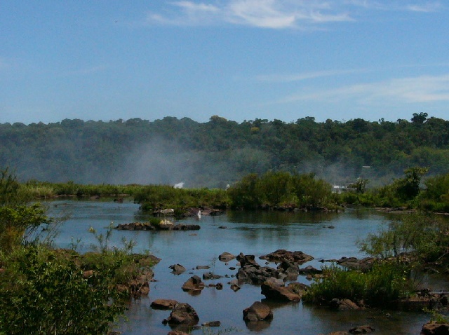 | Looking down the river, it seemed quite normal. | After a while you could see some mist; this isn't a normal river! | Looking a little upstream we began to see some white water. |