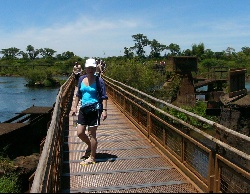 We had signed up for multiple tours, the first of which is mapped out on the right. We took a "tourist train" from the parking area to a station near the river. From the station we hiked across on a long walking bridge to get to the "Throat of Iguazu"; see the red route #1 on the map. Because of