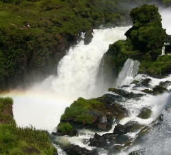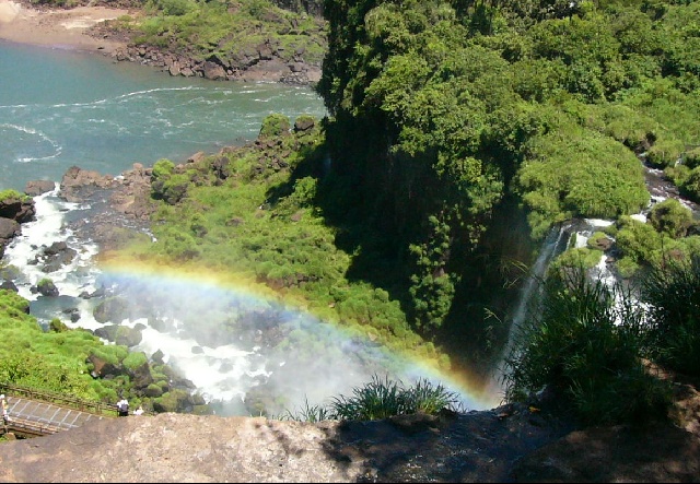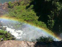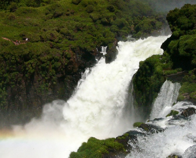 | From this rock ledge, the mist made a nice rainbow. | The mist was constant and the rainbow probably was too. | Over this fall you can see the river that they all feed. |